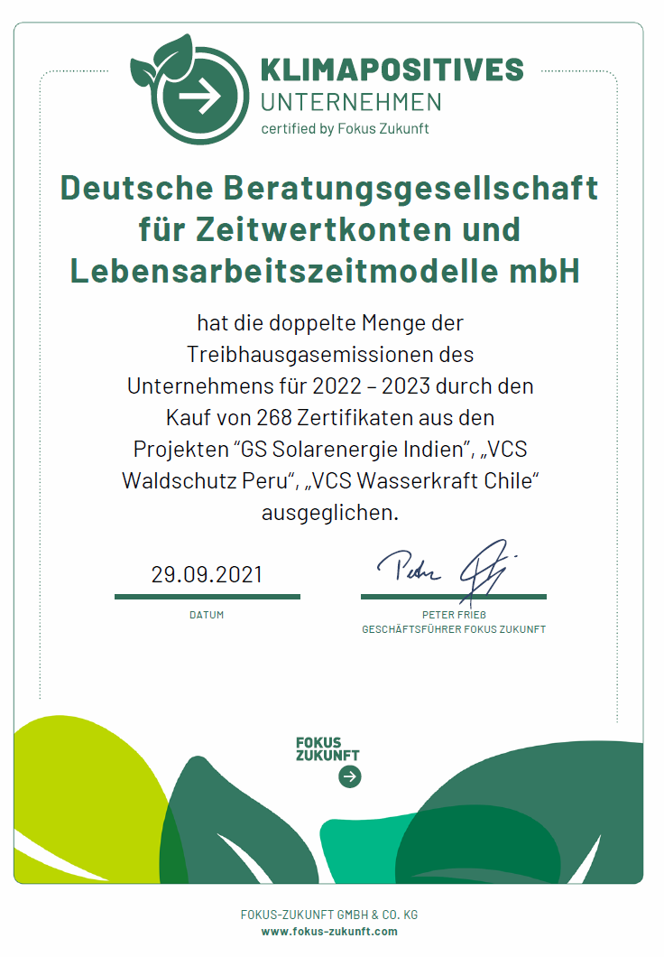Als eines der ersten Unternehmen der Branche kompensiert die Deutsche Beratungsgesellschaft für Zeitwertkonten und Lebensarbeitszeitmodelle (DBZWK) ihre Treibhausemissionen über Klimazertifikate. Mit diesen unterstützen wir zertifizierte Klimaschutzprojekte in Peru und Indien. Auf diese Weise leisten wir einen Beitrag dafür, wie die Welt nachfolgenden Generationen übergeben wird – und gleichen mehr CO₂-Emissionen aus, als wir selber emittieren. Ab sofort arbeitet die DBZWK deshalb nicht nur klimaneutral, sondern ist klimapositiv.