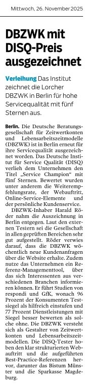 Die Deutsche Beratungsgesellschaft für Zeitwertkonten und Lebensarbeitszeitmodelle (DBZWK) wurde in Berlin vom Deutschen Institut für Service Qualität (DISQ) für herausragende Service-Qualität ausgezeichnet.