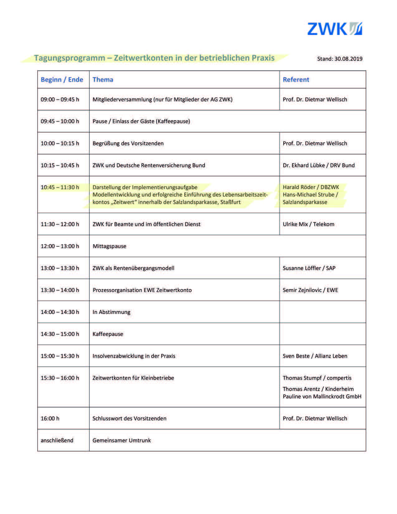 Über das Thema „Modellentwicklung und erfolgreiche Einführung eines Lebensarbeitszeitmodells innerhalb der Salzlandsparkasse“ referiert der Vorstandsvorsitzende der Salzlandsparkasse Hans-Michael Strube und der DBZWK-Geschäftsführer Harald Röder.